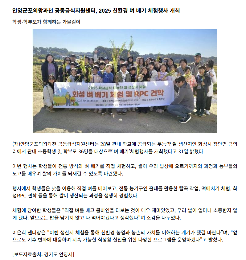 [언론보도]안양군포의왕과천 공동급식지원센터, 2025 친환경 벼 베기 체험행사 개최