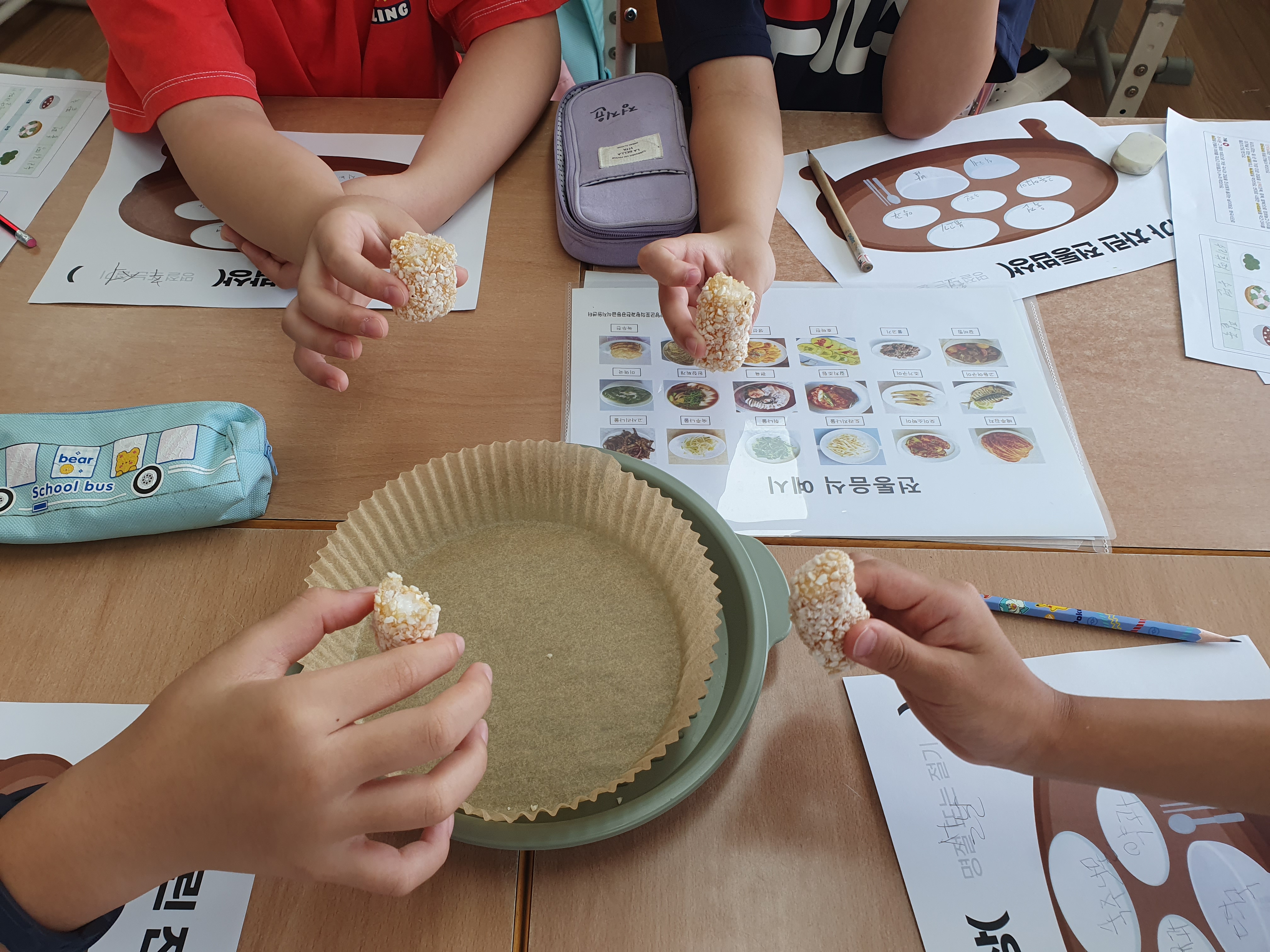 학교 급식 속에 숨어있는 명절음식을 퀴즈로 알아보고 전통음식중 찹쌀유과를 맛보며