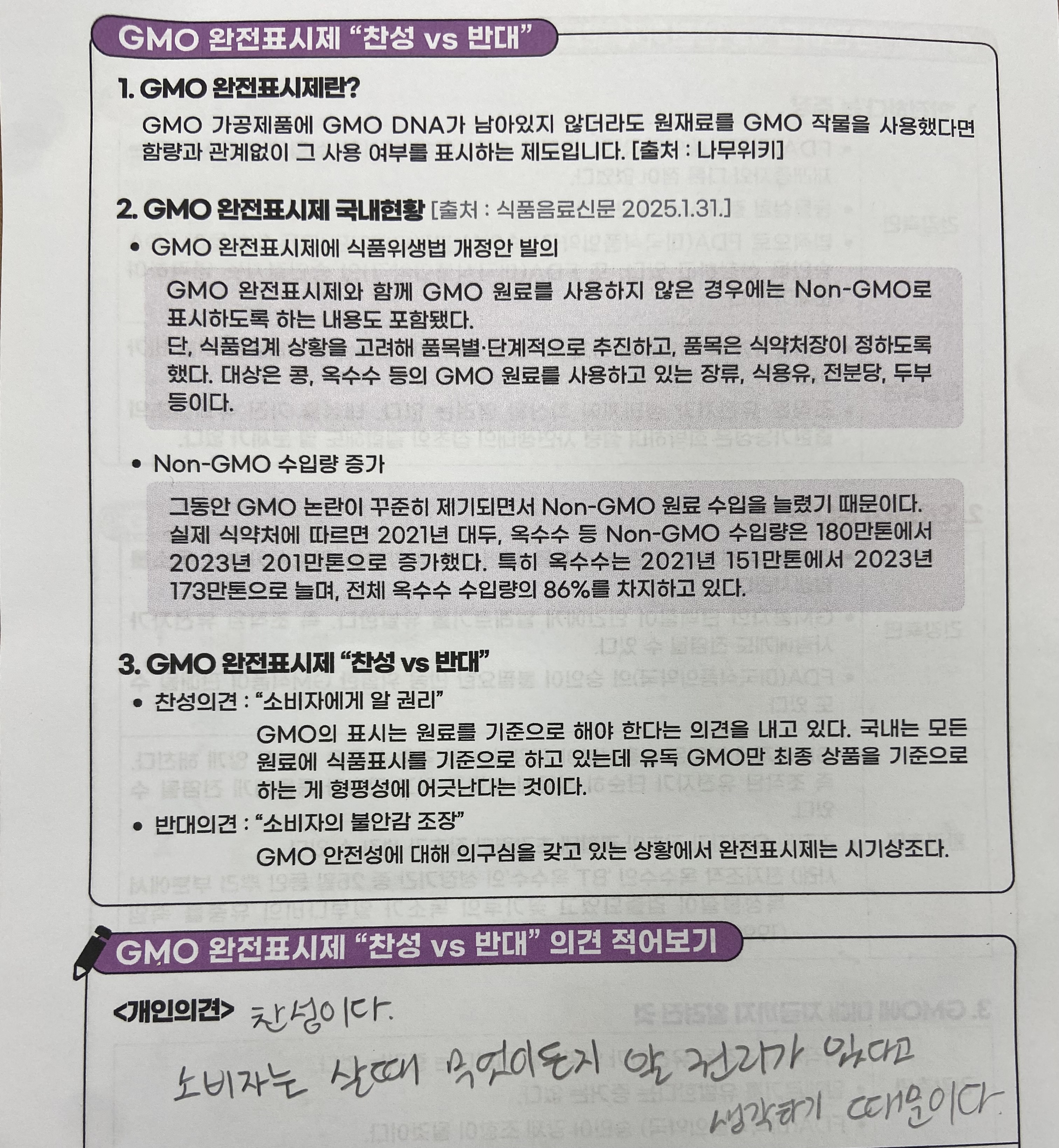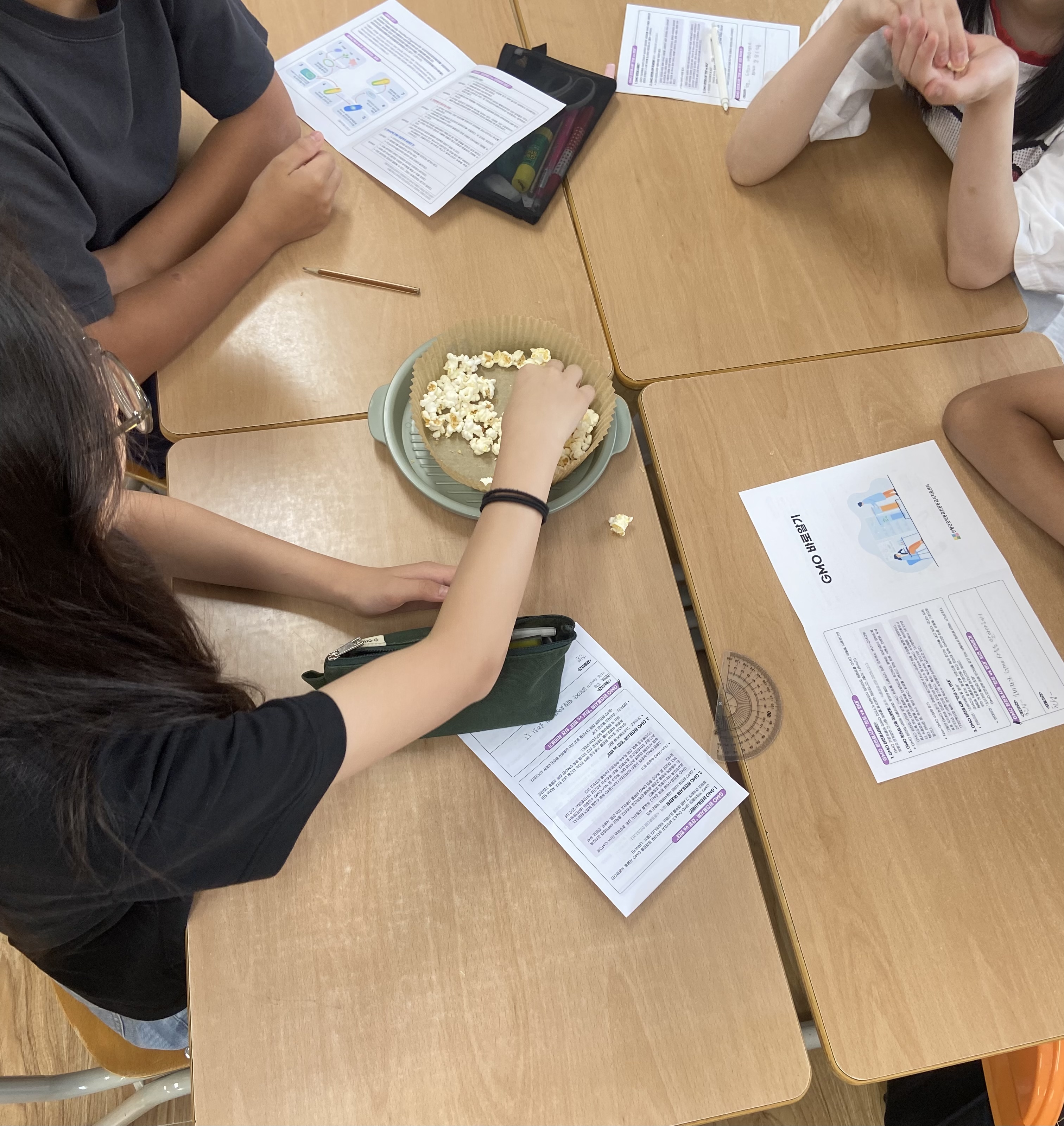 GMO에 대해 알아보고 GMO식품 안전성 논란에 대해 생각해 보았습니다. GMO식품을 구분하기 위해 GMO식품 완전표시제가 시행되는 것에 대해 모둠별로 토론을 해보고 발표해 보며 건강한 식생활을 위해 내가 먹는 먹거리에 대해 다시 한번 생각해보는 시간을 가졌습니다. Non-GMO옥수수를 관찰하고 팝콘을 맛보았습니다.