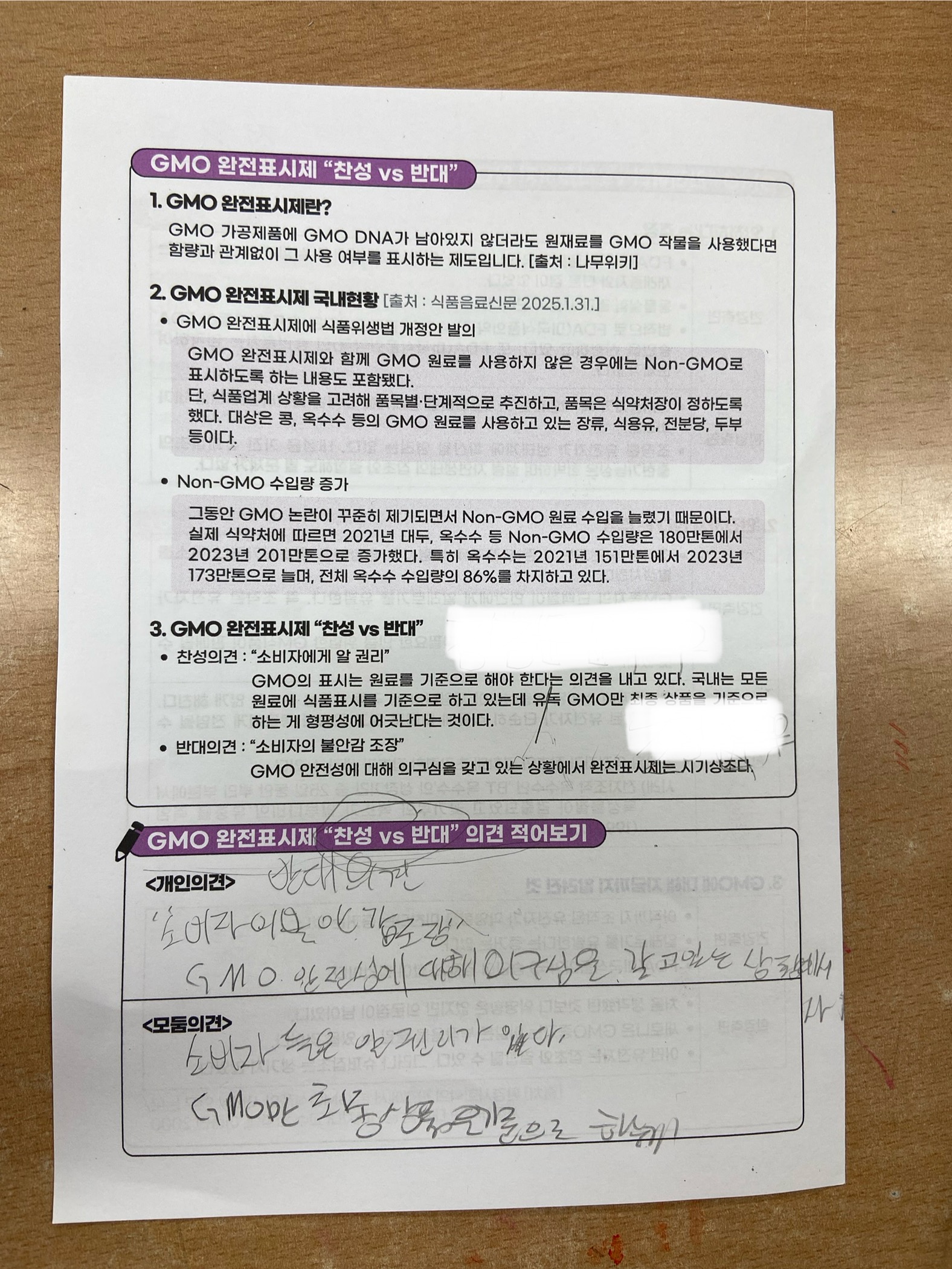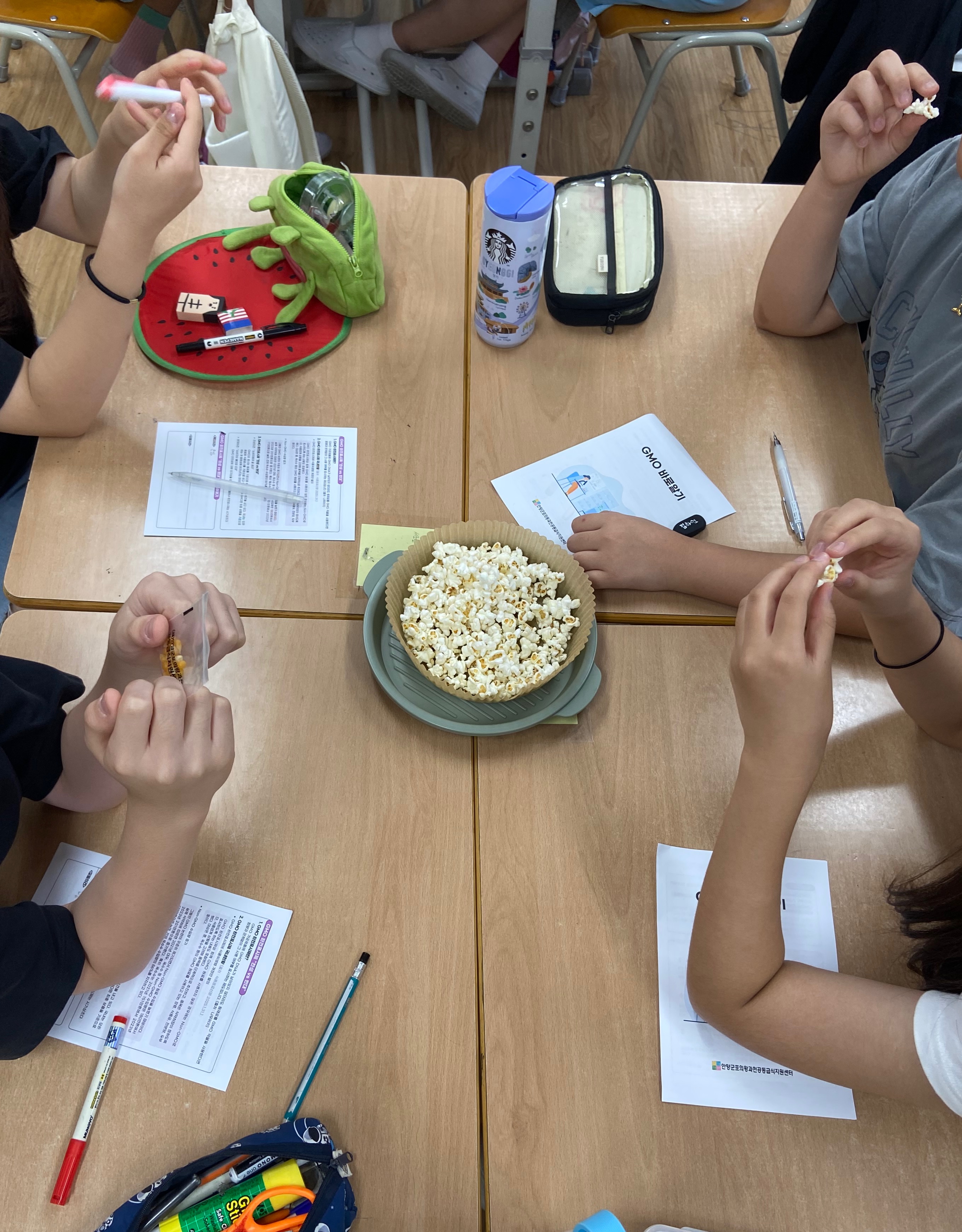 GMO에 대해 알아보고 GMO식품 안전성 논란에 대해 생각해 보았습니다. GMO식품을 구분하기 위해 GMO식품 완전표시제가 시행되는 것에 대해 모둠별로 토론을 해보고 발표해 보며 건강한 식생활을 위해 내가 먹는 먹거리에 대해 다시 한번 생각해보는 시간을 가졌습니다. Non-GMO옥수수를 관찰하고 팝콘을 맛보았습니다.