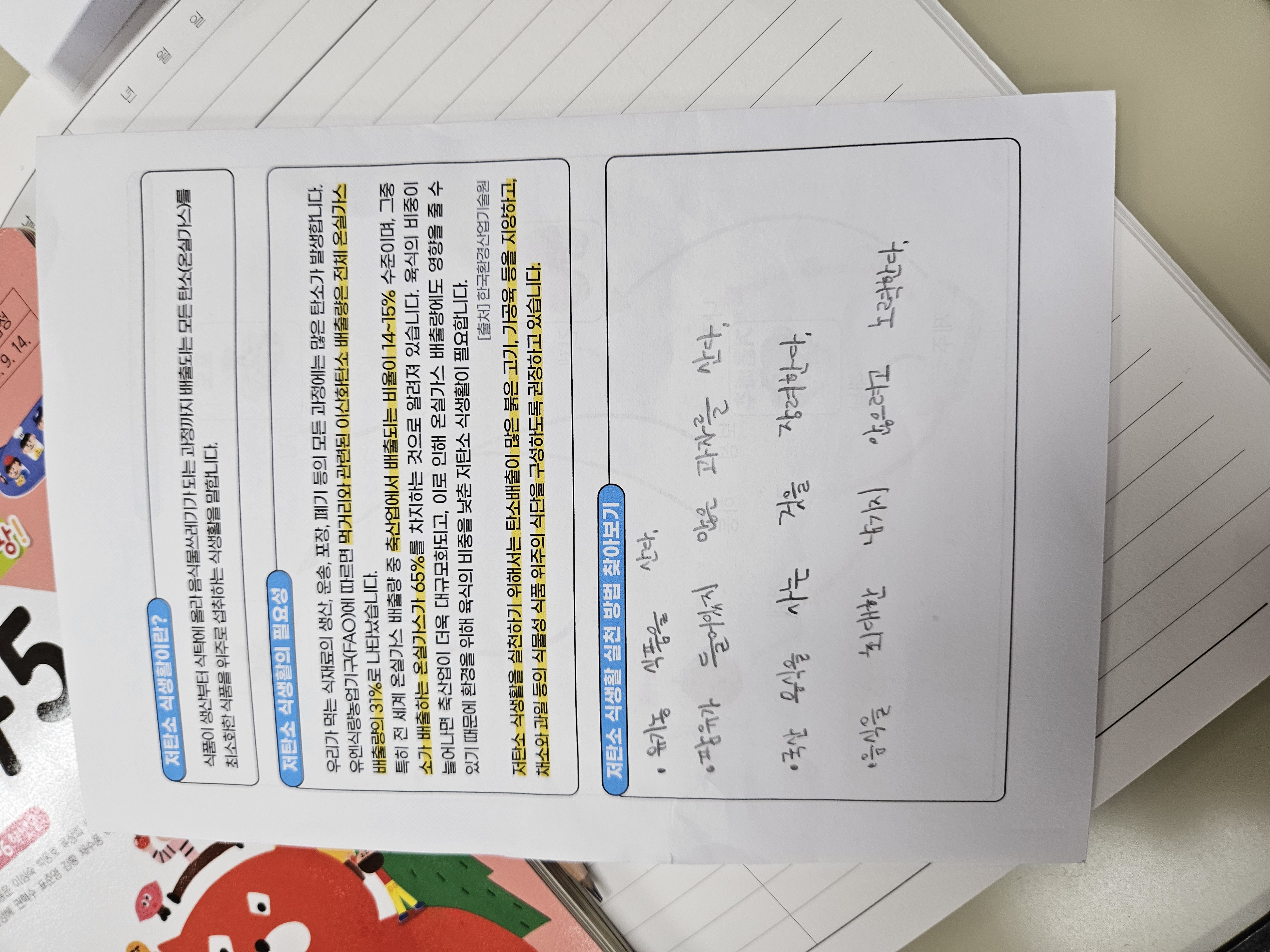 기후 변화에 따른 먹거리의 재배 변화를 보고 놀라며 저탄소식생활 실천으로 여러가지 생각해 보고 발표하는 시간이었습니다.