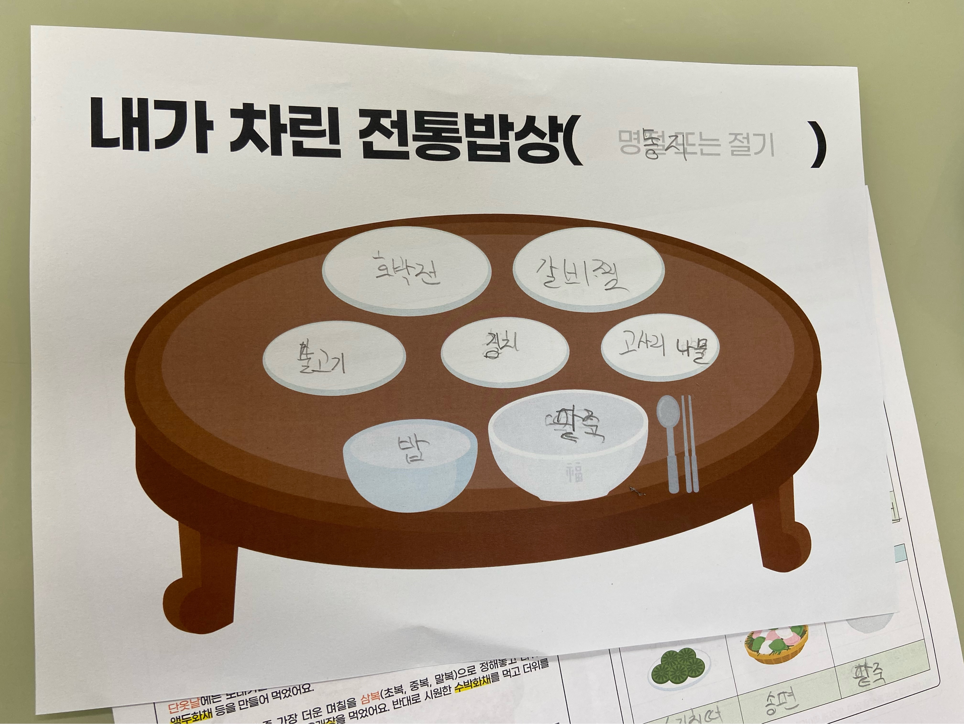 전통음식과 세시풍속에 대해 알아보고 내가 직접 전통밥상을 차린다면 어떻게 차릴지 활동지를 통해 밥상차림을 만들어 보았습니다.