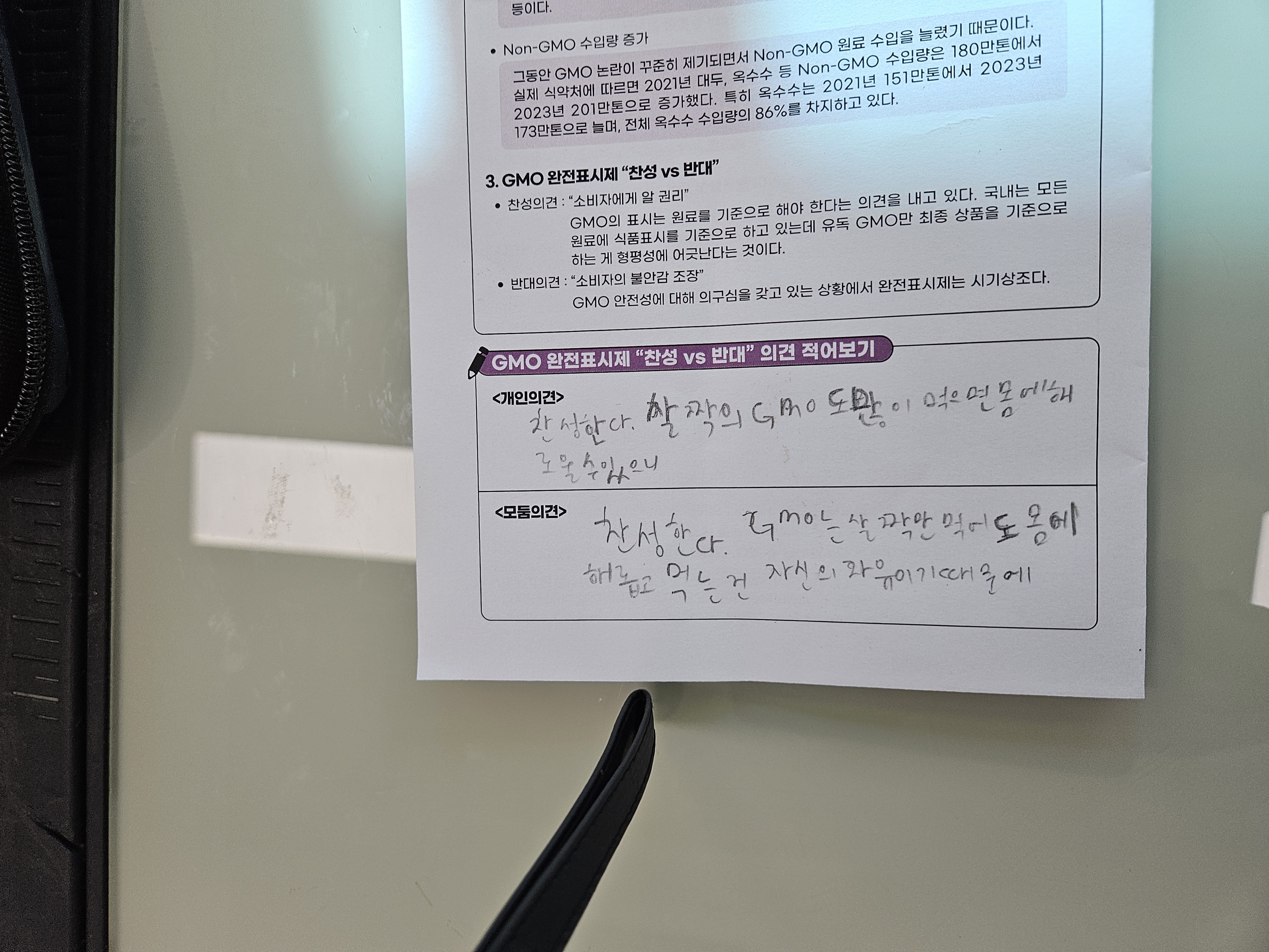 GMO에 대해 알아보고 GMO완전표시제에 소비자가 혼란스러울 수 있으니 표시제에 반대하고 경제적 부담때문에 반대한다는 학생이 몇명 있었습니다. 6학년 생각이 깊고 진지하게 토의하는 모습과 다른 생각도 존중해 주는 태도가 좋았습니다.