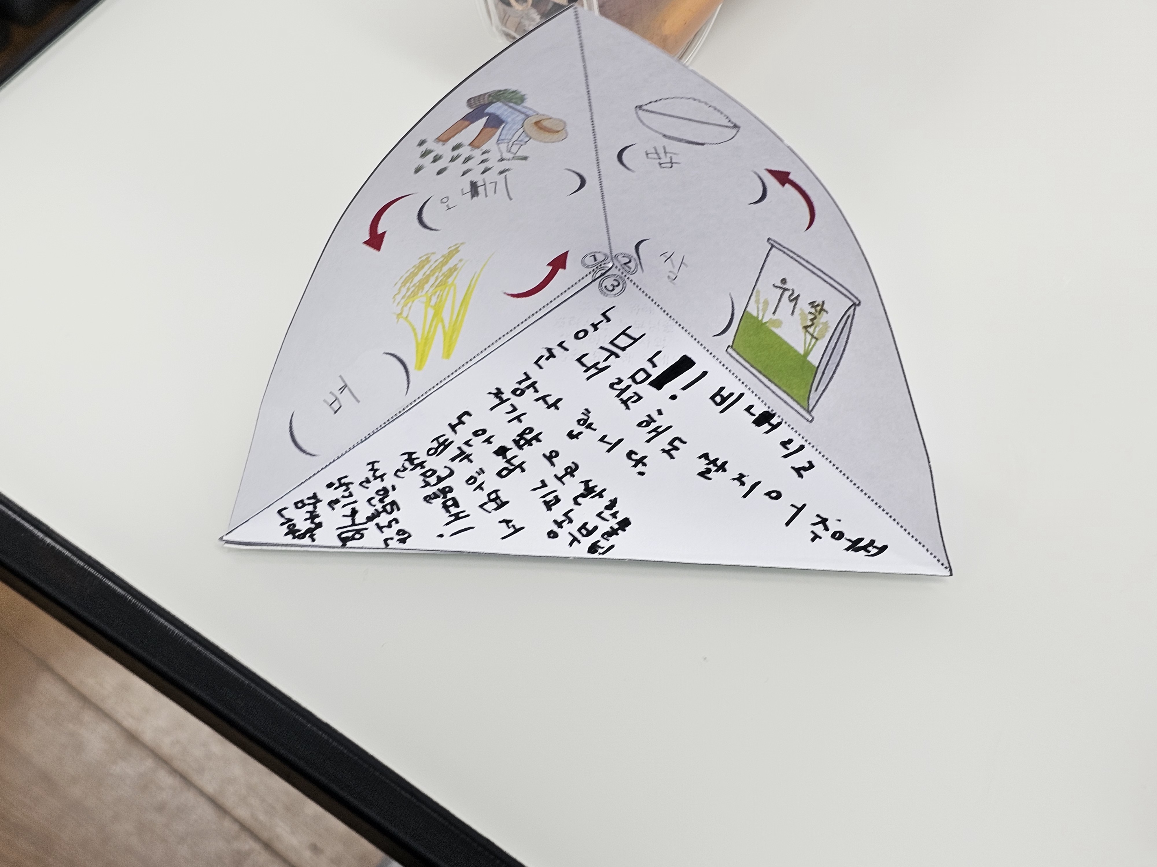 볍씨가 밥이 되기까지의 과정을 알아보고, 볍씨와 현미, 백미, 흑미를 비교 관찰하였습니다. 우리가 밥을 먹을 수 있도록 애써 주시는 농부님께 감사의 마음을 전달하기 위해 카드를 쓰고 발표하는 시간을 가졌습니다.