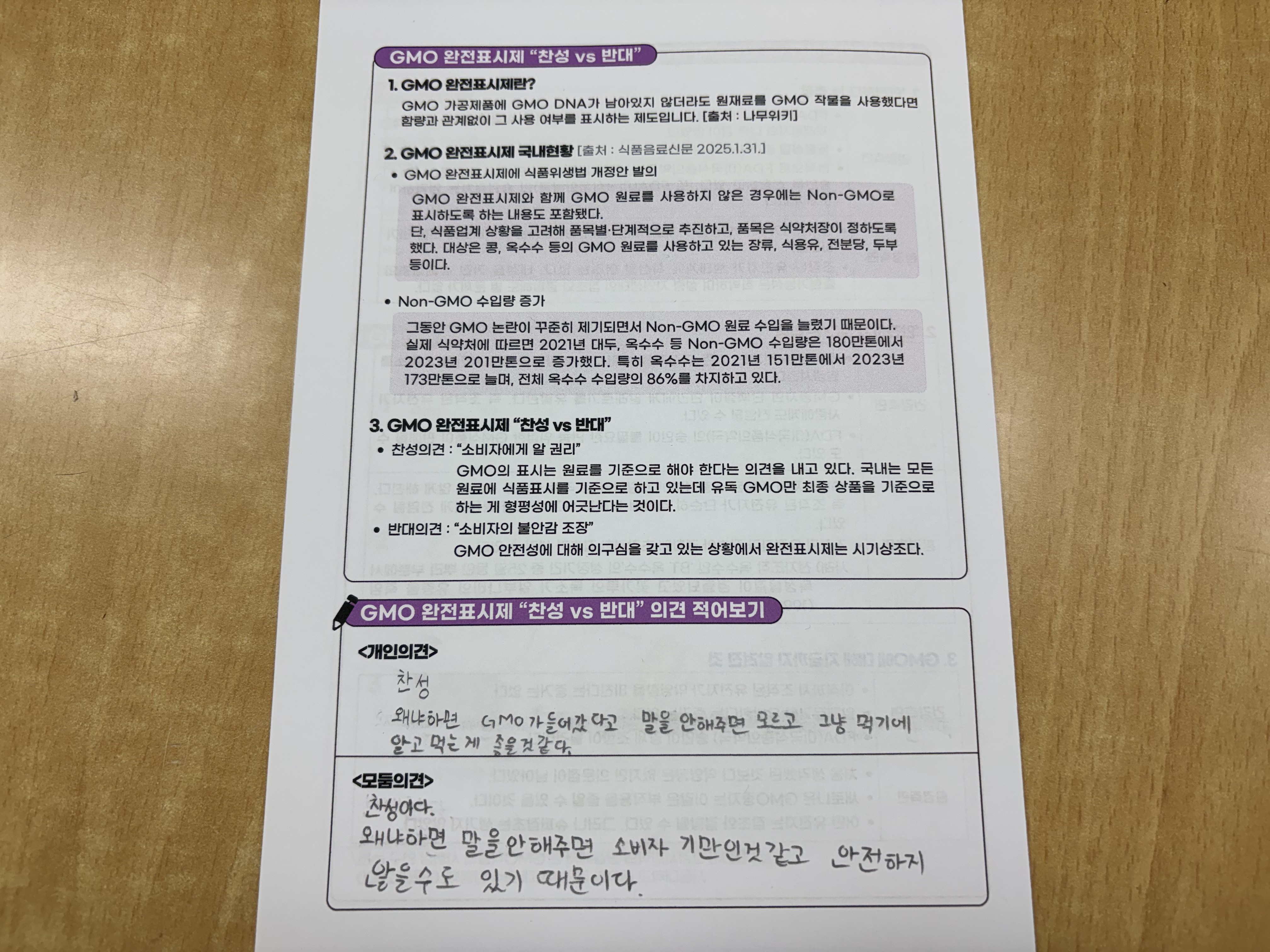 GMO에 대해 알아보고 GMO식품 안전성 논란에 대해 생각해 보았습니다. GMO식품을 구분하기 위해 GMO식품 완전표시제가 시행되는 것에 대해 모둠별로 토론을 해보고 발표해 보며 건강한 식생활을 위해 내가 먹는 먹거리에 대해 다시 한번 생각해보는 시간을 가졌습니다. Non-GMO옥수수를 관찰하고 팝콘을 맛보았습니다.