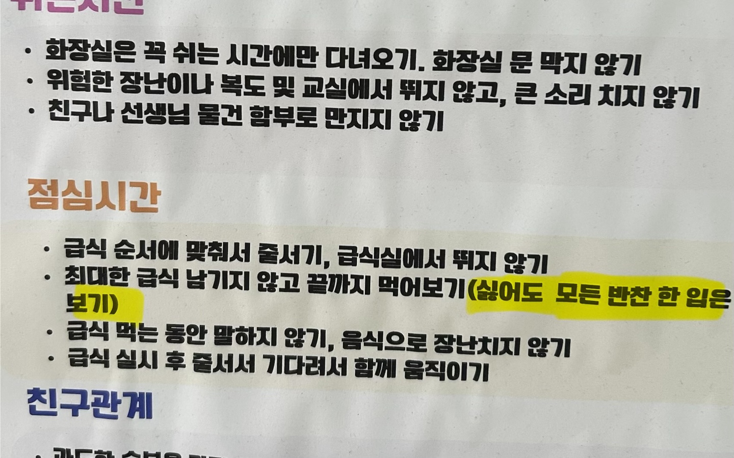 앞으로는 건강한 채소 간식을 즐겨 먹겠다고 이야기 했습니다. 점심시간에 '싫어도 모든 반찬 한입씩 먹어보기'란