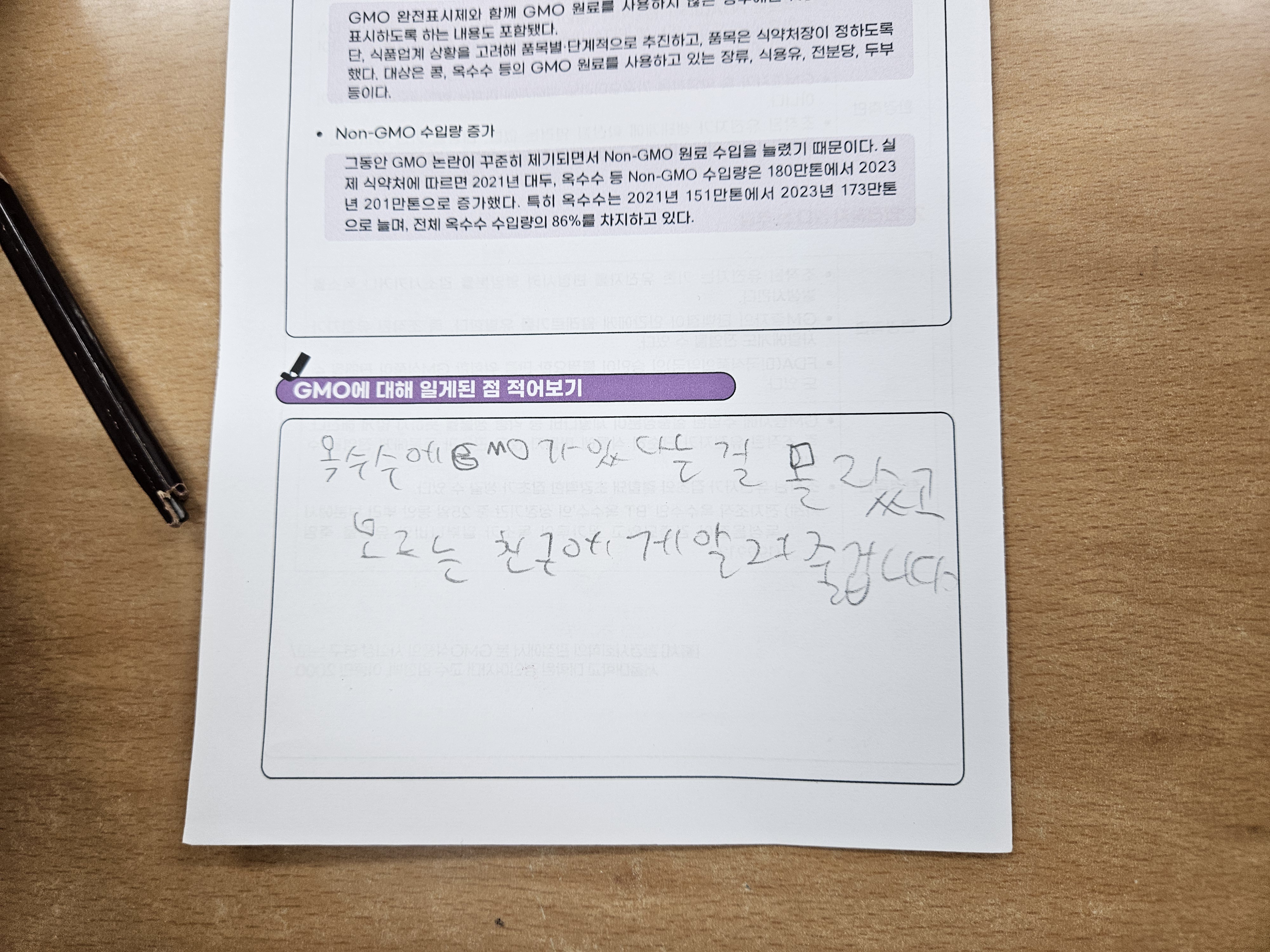Gmo에 대해 새롭게 알게됐고 알게된 걸 다른 가족이나 친구들에게 말해줘야겠다는 학생들이 많았습니다. 우리땅에서 나는 작물들을 먹으면 GMO를 멀리할 수 있는 것을 알았고 국산 식재료로 나오는 급식을 감사한 마음으로 남기지 않고 먹어야겠다고 생각하는 시간이었습니다.